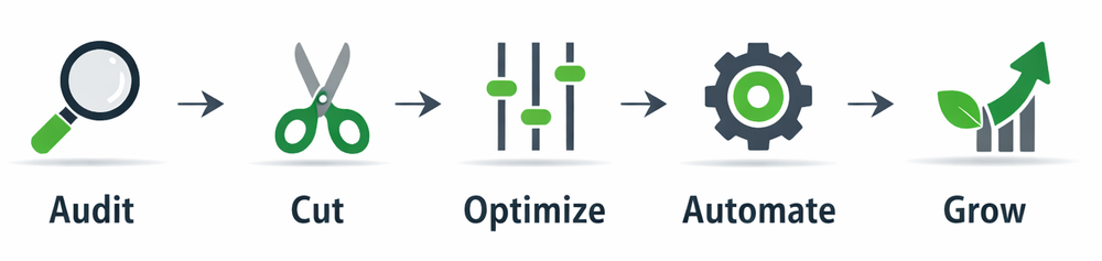 The framework is simple: Audit → Cut → Optimize → Automate → Grow.